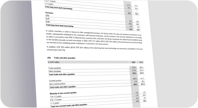 Notes to the Consolidated Financial Statements Notes to the Consolidated Financial Statements (23) Long-term bank borrowings Other payables primarily consist of liabilities for personnel expenses totaling CHF 9.2 million (2019: CHF 8.2 million), liabilities for social contributions totaling CHF 21.7 million (2019: CHF 33.5 million), liabilities for source-deducted taxes and VAT totaling CHF 104.9 million in CHF million 22002200 2019 (2019: CHF 88.8 million) and customers with credit balances totaling CHF 44.9 million (2019: CHF 36.7 million). Maturity 1 to < 2 years 27.3 37.6 (25) Accrued liabilities and deferred income 2 to < 5 years 16.0 16.4 >= 5 years – – Accrued liabilities and deferred income comprise short-term liabilities, which include estimates, short-term expense accruals and Total long-term bank borrowings 4433..33 5544..00 deferrals of income already received but attributable to subsequent accounting periods. Currency (26) Short-term bank borrowings USD 6.0 19.2 EUR 32.6 29.4 in CHF million 22002200 2019 RUB 4.7 5.4 Total long-term bank borrowings 4433..33 5544..00 Currency EUR 49.1 48.4 In certain countries, in order to finance its fleet management business, the Group enters into sale and leaseback transactions of the USD 25.5 88.6 assets, subsequently subleased to the customers, with financial institutions. As the transfers to the financial institutions do not qualify RUB 21.1 28.4 as sales in accordance with IFRS 15 Revenue from contracts with customers, the Group recognizes the related financial liabilities equal Other 47.2 60.6 to the transfer proceeds as bank borrowings. In 2020, CHF 10.7 million (2019: CHF 24.6 million) of the total long-term bank borrowings Total short-term bank borrowings 114422..99 222266..00 are secured by the underlying assets subleased to customers in the same amount. In 2020, CHF 11.9 million (2019: CHF 17.6 million) of the total short-term bank borrowings are secured by the underlying assets subleased In addition, CHF 32.6 million (2019: CHF 29.4 million) of the total long-term bank borrowings are secured by receivables in the same to customers in the same amount (see note (23)). In addition, CHF 27.5 million (2019: CHF 30.9 million) of the total short-term bank amount (see note (14)). borrowings are secured by receivables in the same amount (see note (14)). (24) Trade and other payables (27) Operating income in CHF million 22002200 2019 Categories of operating revenues are as follows: Trade payables 273.0 286.3 in CHF million 22002200 2019 Other payables 213.2 221.6 Total trade and other payables 448866..22 550077..99 Net sales of goods 4,927.4 5,501.7 Net sales of services 404.8 398.2 Current portion 468.4 471.7 Total net sales 55,,333322..22 55,,889999..99 Non-current portion 17.8 36.2 Other operating revenues 149.4 154.9 Total trade and other payables 448866..22 550077..99 Total operating revenues 55,,448811..66 66,,005544..88 Maturity of non-current portion The above categories ‘net sales of goods’ and ‘net sales of services’ in terms of IFRS 15 ‘Revenue from Contract with Customers’ 1 to < 2 years 2.0 4.3 represent, respectively, revenue from sales of goods and revenue from rendering of services, such as logistics, repairs (including service 2 to < 5 years 7.8 23.8 warranty), tests and trainings. Other operating income, amongst others, consists of finance lease interests including related risk >= 5 years 8.0 8.1 premiums. Total non-current trade and other payables 1177..88 3366..22 A breakdown of net sales by geographical areas and by major countries is given in note (34). Currency denominations of the carrying amounts of trade and other payables The revenue recognized that was included in the contract liabilities balance at the beginning of the period totals CHF 111.8 million (2019: CHF 116.6 million). EUR 192.2 191.7 CHF 73.1 37.5 USD 71.6 65.9 Other 149.3 212.8 Total trade and other payables 448866..22 550077..99 The change in trade and other payables includes a currency translation adjustment which reduces trade and other payables by CHF 14.1 million in 2020. This is due to the change in closing rates in 2020 compared to those in 2019. 2020 Financial Report | 58 2020 Financial Report | 59