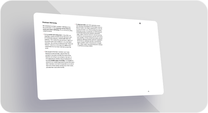 Employee Well-being • On physical health, each Hilti organization drives local activities and programs to encourage a focus on We understand our team members’ well-being to be physical health, from health screening (e.g. in the US) the combination of their physical, mental, 昀椀nancial, to 昀椀tness facilities in our of昀椀ce buildings and healthy social and career well-being. This is vital to delivering employee nutrition. For example, our staff restaurant outperformance. at corporate headquarters features a permanent vegan buffet. To ensure maximum use and sourcing • During mental well-being week in May 2023, we of seasonal and local products, we work with various organized a series of events around the world, such local suppliers. To help combat food waste, we have as mindfulness sessions, mental health talks and created an offering of dishes made from ingredients webinars. This marked the second time a majority of which have an extended shelf life. The remaining the events were made available to our global team organic waste is used in the production of biogas. members. We continue providing one-day “Care and Hilti’s “Rote Haube” personnel restaurant in Schaan Perform” sessions on the topics of resilience and is certi昀椀ed according to ISO22. mindfulness to all our team members around the world. • We recognize that team members want more 昀氀exibility to work remotely. Lessons from the pandemic have demonstrated the opportunities 昀氀exibility can bring to our company. Last year, all Hilti organizations started measures designed to facilitate 昀氀exible ways of working. For example, in several of our market organizations around the world, team members now have the opportunity to work at least half of their weekly working hours from home, provided their tasks allow for this.