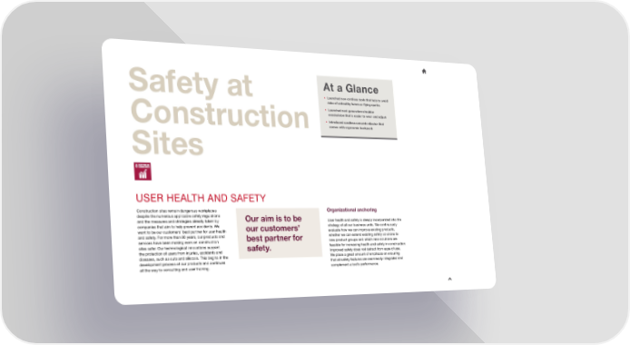 At a Glance Safety at • Launched new cordless tools that help to avoid risks of unhealthy fumes or 昀氀ying sparks • Launched next generation shoulder exoskeleton that is easier to wear and adjust • Introduced cordless concrete vibrator that Construction comes with ergonomic backpack Sites USER HEALTH AND SAFETY Construction sites remain dangerous workplaces Organizational anchoring despite the numerous applicable safety regulations Our aim is to be and the measures and strategies already taken by User health and safety is deeply incorporated into the companies that aim to help prevent accidents. We our customers’ strategy of all our business units. We continuously want to be our customers’ best partner for user health evaluate how we can improve existing products, and safety. For more than 80 years, our products and best partner for whether we can extend existing safety solutions to services have been making work on construction new product groups and which new solutions are sites safer. Our technological innovations support safety. feasible for increasing health and safety in construction. the protection of users from injuries, accidents and Improved safety does not detract from ease of use. diseases, such as cuts and silicosis. This begins in the We place a great amount of emphasis on ensuring development process of our products and continues that all safety features are seamlessly integrated and all the way to consulting and user training. complement a tool’s performance.