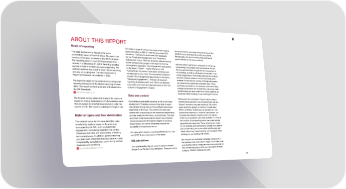 ABOUT THIS REPORT Basis of reporting The table on page 67 shows the scope of the material are accounted for according to the Greenhouse Gas topics according to GRI 3-1 and the associated GRI (GHG) Protocol and reported as CO equivalents. standards. There are no associated GRI standards Besides CO 22 The 2023 Sustainability Report is the fourth 22, this also includes other greenhouse sustainability report of the Hilti Group. The report also for the “Employee Engagement” and “Hazardous gases de昀椀ned by the Kyoto protocol. contains information provided by the Hilti Foundation. Substances” topics. We have therefore referred directly to the corresponding pages in the report to 昀椀nd the The reporting period is the 2023 昀椀nancial year from We have determined Scope 1 emissions for the Group January 1 to December 31, 2023. Deviating reporting management approach. The management approaches using energy consumption and local emission factors. periods of data or content are shown separately. The to the topics “Waste”, “Water Ef昀椀ciency” and We use real information on gas and oil consumption in editorial deadline was March 8, 2024. We are reporting “Contaminant Emissions” have been combined and our buildings, as well as vehicle fuel consumption in our annually on our progress. The next Sustainability are reported jointly in the “Environmental Protection” market organizations. We included estimates for locations Report will therefore be published in 2025. chapter. The management approaches to the topics and time intervals where no consumption data were “Employee Engagement”, “Inclusion & Diversity”, available. For the last two months of the reporting period, The report is based on the internationally recognized “Learning & Development” and “Work-Life Balance” we systematically generated estimated data. These reporting framework of the Global Reporting Initiative have been combined and reported jointly in the “Our estimates are based on, for example, prior period data, (GRI). This report has been prepared with reference to Culture of Engagement” chapter. average consumption per car (vehicles), per square meter the GRI Standards. (warehouses), per repair output hour (repair centers), per GRI Content Index: p. 70 Data and content employee (of昀椀ce buildings) or per building (Hilti stores). The forward-looking statements made in the report are We account for our Scope 2 CO emissions using a 22 based on internal assessments of future developments Quantitative sustainability reporting at Hilti is still under market-based approach, assuming that there are zero that are subject to uncertainties and are not under the development. Therefore, we are not yet able to report Scope 2 emissions for green electricity. We source control of Hilti. The report is published in English only. standardized Group data but have different data bases green electricity globally in the form of certi昀椀cates depending on the topic. The content and data were (RECs or GOOs). Additionally, we generate our own determined using surveys in the respective departments, photovoltaic electricity in some of our locations. We Material topics and their delimitation globally available information, and estimates. The data included estimates for locations and time intervals published in this Sustainability Report was collected where no consumption data were available. For the last The material topics for Hilti were identi昀椀ed using and processed with the highest degree of accuracy. two months of the reporting period, we systematically a materiality analysis based on the principles Nevertheless, we cannot completely exclude the generated estimated data. These estimates are based formulated by the GRI, such as stakeholder possibility of transmission errors. on, for example, prior period data, average consumption engagement, considering impacts in the context per car (vehicles), per square meter (warehouses), per of business activities and relationships, materiality For calculation reasons, rounding differences of ± one repair output hour (repair centers), per employee (of昀椀ce and completeness. In addition, general reporting unit (CHF, % etc.) may occur in the tables. buildings) or per building (Hilti stores). principles were observed: accuracy, balance, clarity, comparability, completeness, sustainability context, CO calculations We analyzed and evaluated our Scope 3 emissions in 22 the upstream and downstream stages of our value chain timeliness and veri昀椀ability. Sustainability Management: p. 4 This Sustainability Report contains data on Scope 1, and identi昀椀ed eleven categories which are applicable for Scope 2 and Scope 3 CO emissions. These emissions Hilti. For the calculation of Scope 3 emissions in every 22 category, different methods are used.