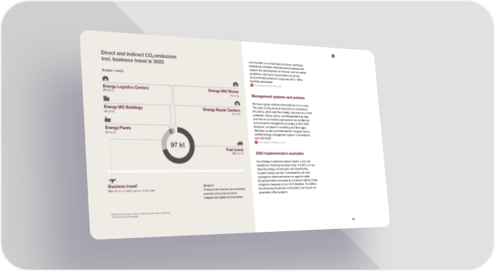 Direct and indirect CO emissions communities is to share best practices, exchange 2 2 experience, establish standardized processes and incl. business travel in 2023 support the development of common environmental guidelines, helping to decentralize and anchor Scopes 1 and 2 environmental protection measures within Hilti’s business processes. Environmental Protection: p. 27 Energy Logistics Centers Energy Hilti Stores 2% (2 kt) 1% (1 kt) Management systems and policies We have a group-wide environmental policy in place. Energy MO Buildings Energy Repair Centers The topic of CO22 emission reductions is anchored in 1% (1 kt) this policy, which sets the strategic approach to climate 2% (2 kt) protection. All our plants, our headquarters facilities and nine of our market organizations are certi昀椀ed for environmental management according to ISO 14001. Energy Plants Moreover, our plants in Kaufering and Nersingen, Germany, as well as in Kecskemét, Hungary, have a 3% (3 kt) certi昀椀ed energy management system in accordance with ISO 50001. 97 kt Environmental Protection: p. 27 Fuel (cars) 69% (67 kt) 2023 implementation examples Our strategy to become carbon neutral in our own operations, including business travel, in 2023 involves reducing energy consumption and transitioning to green energy sources. Consequently, we have managed to reduce emissions by approximately 11 60 percent when compared to a scenario without these Business travel Scope 3 mitigation measures on our 2019 baseline. To address 22% (21 kt, of which approx. 16 kt 昀氀ights) These include emissions from purchased the remaining 40 percent of emissions, we rely on our products and services as well as proprietary offset projects. transport and logistics by third parties. 11 Business travel is part of Scope 3 emissions, but is also considered in the climate neutrality target.