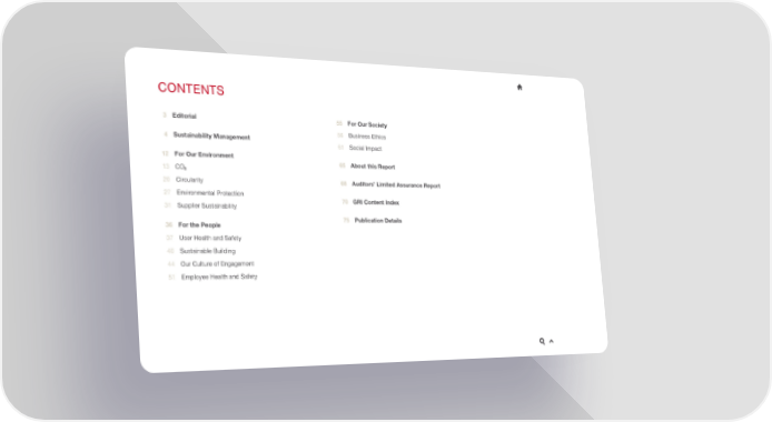 CONTENTS 3 Editorial 55 For Our Society 4 Sustainability Management 56 Business Ethics 61 Social Impact 12 For Our Environment 65 About this Report 13 CO22 20 Circularity 68 Auditors’ Limited Assurance Report 27 Environmental Protection 70 GRI Content Index 31 Supplier Sustainability 36 For the People 75 Publication Details 37 User Health and Safety 40 Sustainable Building 44 Our Culture of Engagement 51 Employee Health and Safety