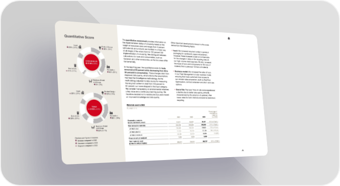Quantitative Score The quantitative assessment provides information on Other important developments relevant to the score the implementation status of circularity based on the derive from the following topics: weight of resources used and ranges from 0 percent Input Product Design (all materials and products are handled in a linear way • Input: We increased recycled content in product 23% (26%) 62% (63%) packaging for cardboard, paper and polymers. at all stages of the value chain) to 100 percent (full However, these increases could not compensate implementation of circularity). We distinguish between for the changes in data on the recycling rates of calculations for tools and consumables, such as our high-volume steel suppliers. We also increased fasteners and other accessories, as the two areas differ CONSUMABLES fundamentally. the reuse of tools and components to 150 tons of Ø36% (38%) material, from a previous 120 tons of material. In the reporting year, the quantitative score for tools End of Life Production remained at 55 percent while decreasing from 38 to • Business model: We increased the sales of tools 11% (11%) 82% (83%) 36 percent in consumables. These changes stem from in our Fleet Management circular business model, ensuring that more customers have access to improved data quality, which informs the assumptions our circular value proposition, such as Tool Park that feed the Circelligence methodology. As the Optimization, contract extension and short-term use Business Model methodology adjusted its data source for measuring and Usage the recycled content in steel from 100 percent to options. 3% (4%) 90 percent, our score dropped in the input category. We consider transparency on environmental initiatives • End of life: The tools’ End-of-Life score experienced a decline due to better data quality, primarily Input Product Design a key value and a continuous learning journey. We 28% (28%) 58% (59%) characterized by the adoption of updated, often therefore decided not to restate previous years based lower, rates for both internal and external (statistical) on improved knowledge and data quality. recycling. TOOLS MMaatteerriiaalls us usseed id in 2n 2002233 Ø55% (55%) By weight (in t) Percentage of recycled raw End of Life Production materials 30% (38%) 89% (88%) 2021 2022 2023 (vs. 2022) Renewable materials (paper, cardboard, wood) 31,611 32,220 30,157 50% (+2%pts.) Business Model Non-renewable materials 244,736 255,839 226,992 21% (–3%pts.) and Usage of which steel 152,622 158,197 139,621 31% (–4%pts.) 68% (61%) of which plastics 17,751 19,779 21,155 10% (+2%pts.) of which chemicals 53,468 56,210 45,695 0% (0%) Previous year 昀椀gures in brackets Products not yet analyzed 7,564 6,552 5,608 Increase compared to 2022 Decrease compared to 2022 Total materials used (products and packaging) 283,911 294,611 262,757 24% (–2%pts.) Stagnant compared to 2022