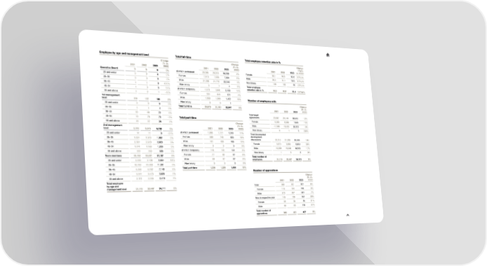 EmpEmpllooyyeeee b byy ag agee a anndd m maannagageemmenentt le levvelel TToottaall fu fullll--ttimeime TToottaal el emmppllooyyeee re reetteennttiioon rn raatte ie in %n % Change Change Change (% vs. (% vs. (%pts. 2021 2022 2023 2022) 2021 2022 2023 2022) 2021 2022 2023 vs. 2022) Executive Board 6 6 6 0% of which permanent 28,306 29,313 30,538 4% Female 90.1 90.3 90.6 0.3%pts. 25 and under 0 0 0 0% Female 7,013 7,539 7,994 6% Male 90.4 91.1 91.6 0.5%pts. 26–35 0 0 0 0% Male 21,288 21,770 22,540 4% Non-binary 100 100 80 –20%pts. 36–45 1 1 0 –100% Non-binary 5 4 4 0% Total employee 46–54 4 3 5 67% of which temporary 1,573 1,848 2,109 14% retention rate in % 90.3 90.9 91.4 0.5%pts. 55 and above 1 2 1 –50% Female 504 643 671 4% 1st management Male 1,069 1,205 1,437 19% NNumumbberer o off em emppllooyyeeeess wi witthh level 179 177 180 2% Non-binary 0 0 1 25 and under 0 0 0 0% Change Total full-time 29,879 31,161 32,647 5% (% vs. 26–35 4 4 4 0% 2021 2022 2023 2022) 36–45 80 68 72 6% Total target 46–54 70 78 76 –3% TToottaall pa parrtt--ttiimmee agreements 23,687 25,145 28,045 12% 55 and above 25 27 28 4% Change Female 6,095 6,686 7,689 15% 2nd management (% vs. Male 17,589 18,454 20,353 10% level 5,775 6,373 6,738 6% 2021 2022 2023 2022) Non-binary 3 1 3 200% 25 and under 14 11 8 –27% of which permanent 1,090 1,177 1,310 11% Total documented 26–35 1,824 1,973 1,982 0% Female 689 749 825 10% development Male 401 428 485 13% discussions 22,314 21,335 25,166 18% 36–45 2,387 2,673 2,923 9% Female 5,674 5,684 6,804 20% 46–54 1,041 1,163 1,220 5% Non-binary 0 0 0 0% Male 16,639 15,648 18,359 17% 55 and above 509 553 605 9% of which temporary 146 149 154 3% Non-binary 1 3 3 0% Team members 25,155 25,931 27,187 5% Female 77 62 67 8% Total number of 25 and under 2,039 2,408 2,664 11% Male 69 87 87 0% employees 31,115 32,487 34,111 5% 26–35 10,790 11,033 11,331 3% Non-binary 0 0 0 0% 36–45 6,568 6,762 7,148 6% Total part-time 1,236 1,326 1,464 10% 46–54 3,377 3,473 3,626 4% NNumumbberer o off a apppprreennttiicceess 55 and above 2,111 2,255 2,418 7% Change (% vs. Total employee 2021 2022 2023 2022) by age and Total 383 401 427 6% management level 31,115 32,487 34,111 5% Female 110 104 110 6% Male 273 297 317 7% New in respective year 145 128 164 28% Female 53 35 46 31% Male 92 93 118 27% Total number of apprentices 383 401 427 6%
