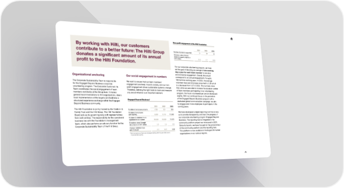 NNoonn--pprroo昀椀昀椀t et ennggaaggeemmeennt ot of tf thhe He Hiilltti Fi Foouunnddaattiioonn By working with Hilti, our customers 2021 2022 2023 contribute to a better future: The Hilti Group Number of projects supported 76 88 89 Monetary value of invest- ments in support projects in donates a signi昀椀cant amount of its annual CHF million 31.9 47.1 47.9 pro昀椀t to the Hilti Foundation. For our corporate volunteering program, we have set the goal of devoting an average of one working day a year for each team member to social or environmental engagement. Overall, this would Organizational anchoring Our social engagement in numbers correspond to an annual engagement of roughly 160 full-time working years. In 2023, the average The Corporate Sustainability Team is responsible We want to ensure that our team members’ volunteer days per employee amounted to 0.26 which for the Engaged Beyond Business corporate engagement positively impacts society, and our non- is a decrease from 0.27 in 2022. The numbers show volunteering program. The Corporate Sustainability pro昀椀t engagement drives sustainable systemic change. that, while we were able to increase the absolute number Team coordinates the social engagement of team Therefore, de昀椀ning the right tools to track and measure of team members participating in our volunteering members worldwide at the Group level. It makes any social initiative is an important element. program, the hours volunteered per person decreased general recommendations to Hilti organizations, steers slightly. With our continued focus on the promotion local implementation of the targets and facilitates a 11 of the Engaged Beyond Business program with a structured experience exchange within the Engaged EEngngagageedd B Beeyyoonndd B Buussineinessss dedicated global communication campaign, we aim Beyond Business community. to engage even more employees to participate in the 2021 2022 2023 coming years. The Hilti Foundation is jointly funded by the Martin Hilti Number of employee projects > 300 637 854 Family Trust and the Hilti Group. The Hilti Foundation Number of employees We have developed a digital reporting tool that allows Board acts as its governing body with representatives participating 6,000 9,145 11,563 us to provide transparency and track the progress of from both entities. The responsibility for the operational Number of volunteer hours our corporate volunteering program Engaged Beyond business lies with the Foundation’s management registered in our system 26,000 69,000 71,672 Business. The reporting tool is integrated in the team, which also performs an advisory function for the Donations raised through community platform project we introduced in 2021. Corporate Sustainability Team of the Hilti Group. our projects in CHF million 1.3 1.5 1.1 Since its launch, we have focused on the global rollout Average volunteer days of the community platform and the reporting tool. per employee 0.1 0.27 0.26 This platform is now available in the largest 20 market 1 1 More accurate numbers are displayed starting with the year 2022 due to organizations in our various regions. improved data quality