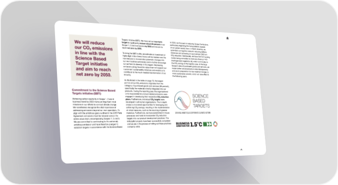 Targets initiative (SBTi). We have set our near-term In 2023, we focused on reducing Scope 3 emissions, target to signi昀椀cantly reduce about 30 percent in our particularly regarding the transportation aspects We will reduce Scope 1, 2 and 3 emissions by 2032 and we aim to of our global supply chain. In North America, we our CO emissions reach net zero by 2050. optimized our logistics network, reducing delivery 2 distances and achieving an approximate 3000 ton in line with the To bring the SBTi to life, we estimate an investment of CO22 reduction. Additionally, we have the 昀椀rst trucking triple-digit million Swiss francs will be needed over the routes being converted to more eco-friendly HVO Science Based next decade to incorporate systematic changes into (hydrogenated vegetable oil), which contributes to our own business processes and to further encourage the CO savings in the logistics area. In the large our partners to develop in this regard. Decreasing 22 Target initiative Scope 3 area of purchased goods and services, we emissions along the entire value chain will support our made further advancements in data transparency and aim to reach customers’ sustainability initiatives and enable us to and are in preparation for raw material changes to contribute to the much-needed transformation of our more sustainable variants, which will take effect in net zero by 2050. industry. the following years. As illustrated in the table on page 19, the largest portion of our CO emissions originates from the 22 category of purchased goods and services (69 percent), speci昀椀cally the materials directly integrated into our Commitment to the Science Based products. During the reporting year, the organizational Targets initiative (SBTi) units responsible for product-related emissions were engaged in developing their respective CO22 reduction Achieving carbon neutrality in Scope 1, 2 and in plans. Furthermore, individual CO22 targets were business travel by 2023 marks an important initial developed in all market organizations. The in-depth milestone in our efforts to combat climate change. analysis uncovered opportunities for leveraging and We nonetheless recognize the vital importance of achieving CO22 savings, resulting in the implementation addressing emissions beyond our own operations. To of initial measures, such as the sourcing of greener align with the ambitious goals outlined in the 2015 Paris materials. Furthermore, we have established in-house Agreement, emissions must be reduced across the processes and tools to incorporate CO22 reduction entire value chain, encompassing Scopes 1, 2 and 3. targets into our product development practices. The We are committed to contributing to this extremely initial pilot projects have been successfully completed ambitious endeavor and have therefore pledged to and we are in the process of rolling out these practices establish targets in accordance with the Science Based company-wide.