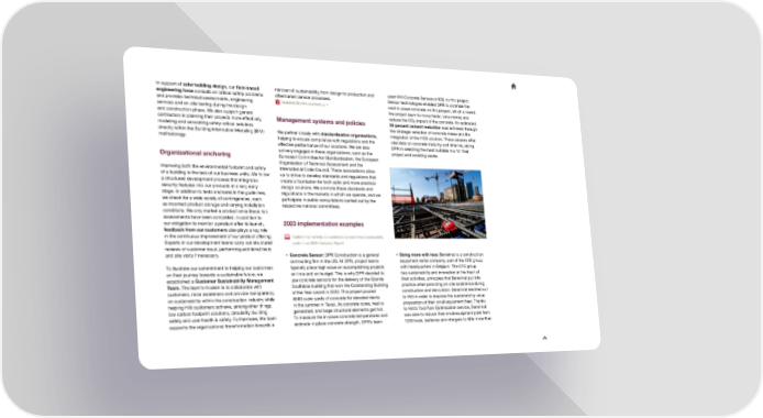 In support of safer building design, our 昀椀eld-based mindset of sustainability, from design to production and used Hilti Concrete Sensors (HCS) on this project. engineering force consults on critical safety problems aftermarket service processes. Sensor technologies enabled DPR to optimize the and provides technical assessments, engineering Sustainability Management: p. 4 cast-in-place concrete on this project, which allowed services and on-site testing during the design the project team to move faster, save money and and construction phase. We also support general reduce the CO impact of the concrete. An estimated contractors in planning their projects more effectively, 22 Management systems and policies 24 percent cement reduction was achieved through modeling and calculating safety-critical solutions the strategic selection of concrete mixes and the directly within the Building Information Modeling (BIM) We partner closely with standardization organizations, integration of the HCS solution. These sensors offer methodology. helping to ensure compliance with regulations and the vital data on concrete maturity and timeline, aiding effective performance of our solutions. We are also DPR in selecting the most suitable mix for their actively engaged in these organizations, such as the project and avoiding waste. Organizational anchoring European Committee for Standardization, the European Organization of Technical Assessment and the Improving both the environmental footprint and safety International Code Council. These associations allow of a building is the task of our business units. We follow us to strive to develop standards and regulations that a structured development process that integrates create a foundation for both safer and more practical security features into our products at a very early design solutions. We promote these standards and stage. In addition to tests anchored in the guidelines, regulations in the markets in which we operate, and we we check for a wide variety of contingencies, such participate in public consultations carried out by the as incorrect product storage and varying installation respective national committees. conditions. We only market a product once these risk assessments have been completed. In addition to our obligation to monitor a product after its launch, 2023 implementation examples feedback from our customers also plays a key role in the continuous improvement of our product offering. E xplore how we help our customers to reach their sustainability Experts in our development teams carry out structured goals in our 2022 Company Report reviews of customer input, performing additional tests and site visits if necessary. • Concrete Sensor: DPR Construction is a general • Doing more with less: Benelmat is a construction contracting 昀椀rm in the US. At DPR, project teams equipment rental company, part of the CFE group, To illustrate our commitment to helping our customers typically place high value on accomplishing projects with headquarters in Belgium. The CFE group on their journey towards a sustainable future, we on time and on budget. This is why DPR decided to has sustainability and innovation at the heart of established a Customer Sustainability Management use concrete sensors for the delivery of the Granite their activities, principles that Benelmat put into Team. The team’s mission is to collaborate with Southlake building that won the Outstanding Building practice when providing on-site assistance during customers, raise awareness and provide transparency of the Year award in 2022. This project poured construction and renovation. Benelmat reached out on sustainability within the construction industry while 4540 cubic yards of concrete for elevated decks to Hilti in order to improve the sustainability value helping Hilti customers achieve, among other things, in the summer in Texas. As concrete cures, heat is proposition of their small equipment 昀氀eet. Thanks low carbon footprint solutions, circularity, building generated, and large structural elements get hot. to Hilti’s Tool Park Optimization service, Benelmat safety and user health & safety. Furthermore, the team To measure the in-place concrete temperatures and was able to reduce their small equipment park from supports the organizational transformation towards a estimate in-place concrete strength, DPR’s team 1200 tools, batteries and chargers to little more than