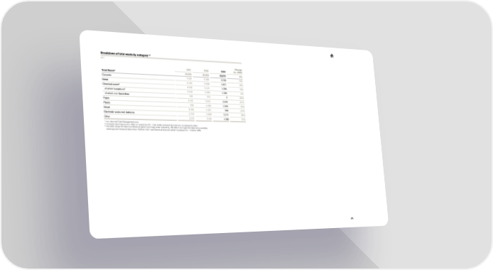 1,1, 2 2 BBrreeaakdkdoowwn on of tf toottaal wl waasstte be by cy caatteeggoorry y in t Change 2021 2022 2023 (vs. 2022) Total Waste33 25,224 26,353 26,272 0% Concrete 7,522 6,583 6,160 –6% Metal 6,433 6,268 5,877 –6% Chemical waste33 1,252 1,441 1,396 –3% of which hazardous33 1,152 1,326 1,390 5% of which non-hazardous 101 115 6 –95% Paper 2,951 3,654 2,659 –27% Plastic 889 1,180 1,059 –10% Wood 1,385 1,227 968 –21% Electronic waste incl. batteries 2,715 2,803 3,771 35% Other 2,077 3,197 4,382 37% 11 Incl. returned Fleet Management tools 22 Increased reporting scope in 2022 compared to 2021; total waste decreased by 2 percent excluding this effect 33 The 2022 values for Chemical Waste (of which hazardous) were restated by 108t due to more granular data being available, reducing total Chemical Waste from 1549t to 1441t and Chemical Waste (of which hazardous) from 1434t to 1326t.