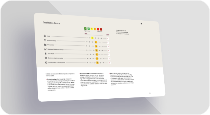 Qualitative Score A B C D E F The rating is based on the highest score lowest score British school grading system (A = very good / F = insuf昀椀cient) 2023 2022 Input A B C D E F C Product Design A B C D E F E Production A B C D E F D Business Model and Usage A B C D E F E End of Life A B C D E F E Business Implementation A B C D E F D Collaboration & Ecosystems A B C D E F D In 2023, we improved in three categories compared to • Business model: Overall, the full integration of • End of life: We signi昀椀cantly improved the previous years: targets for circular economy into our new group transparency of end-of-life initiatives, including strategy, with trackers at every level, ensures a reuse and recycling. We also expanded the share • Product design: We increasingly implement high level of engagement and action across the of products for which repair and maintenance circularity in product design, building on our history organization. We are running an increasing number of services are available. We are continuing to expand of designing for longevity and repairability, and will pilots with customers to test different modes of reuse this transparency through supplier engagement in the future focus even more on design for reuse. for our tools. The customer feedback so far has been and reporting, as well as control of our own reuse Together with our targets to reduce our product very positive. operations. carbon footprint, these will be a key focus in the coming years.
