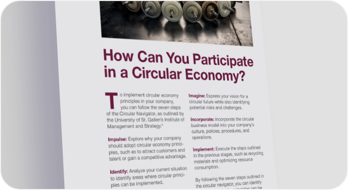 How Can You Participate in a Circular Economy? o implement circular economy Imagine: Express your vision for a principles in your company, circular future while also identifying Tyou can follow the seven steps potential risks and challenges. of the Circular Navigator, as outlined by the University of St. Gallen’s Institute of Incorporate: Incorporate the circular 3 Management and Strategy. business model into your company’s culture, policies, procedures, and Impulse: Explore why your company operations. should adopt circular economy princi- ples, such as to attract customers and Implement: Execute the steps outlined talent or gain a competitive advantage. in the previous stages, such as recycling materials and optimizing resource Identify: Analyze your current situation consumption. to identify areas where circular princi- ples can be implemented. By following the seven steps outlined in the circular navigator, you can identify Ideate: Look beyond existing solutions areas where circular principles can be to 昀椀nd new ways to reduce resource implemented and realize the bene昀椀ts consumption and waste production. of a closed-loop system. Once you take action, you could save money on Integrate: Design your own consistent disposal costs, reduce your carbon ecosystem to ensure that circular princi- footprint, and create new business ples are integrated into every aspect of opportunities by attracting environmen- your company. tally conscious customers and talent. / 5