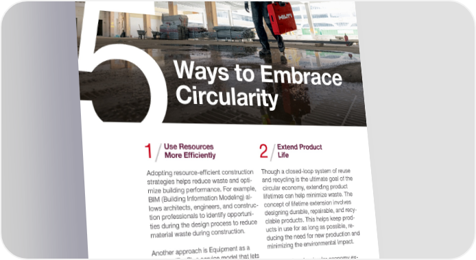 Ways to Embrace Circularity 5 Use Resources Extend Product More Ef昀椀ciently Life 1/ 2/ Adopting resource-ef昀椀cient construction Though a closed-loop system of reuse strategies helps reduce waste and opti- and recycling is the ultimate goal of the mize building performance. For example, circular economy, extending product BIM (Building Information Modeling) al- lifetimes can help minimize waste. The lows architects, engineers, and construc- concept of lifetime extension involves tion professionals to identify opportuni- designing durable, repairable, and recy- ties during the design process to reduce clable products. This helps keep prod- material waste during construction. ucts in use for as long as possible, re- ducing the need for new production and Another approach is Equipment as a minimizing the environmental impact. Service (EaaS), a service model that lets companies access equipment, tools, or The bene昀椀ts of a circular economy ex- other resources on a usage basis. This tend beyond the ecological – they can can minimize waste by reducing the bring economic gains too. For example, need for new purchases and disposals. a construction company could recycle EaaS providers are typically responsible concrete from demolition sites and use it for maintaining and repairing equipment, to make new concrete, which would not helping to ensure it's always in good only reduce waste but also save money working order while maximizing its value on disposal costs. over its lifetime. / 3