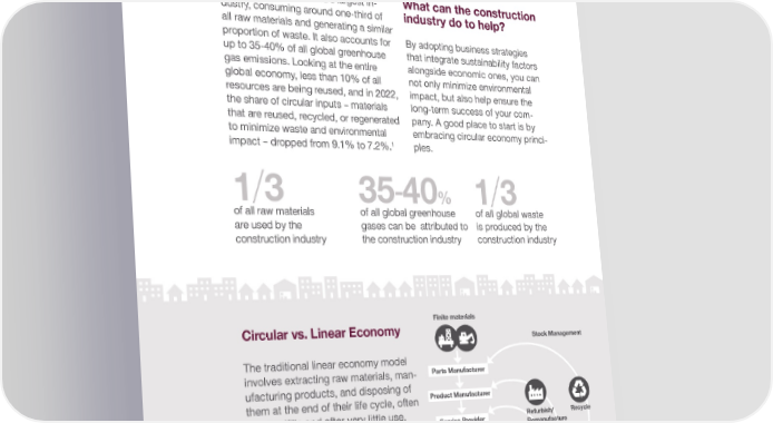 Introduction Construction is the world’s largest in- What can the construction dustry, consuming around one-third of industry do to help? all raw materials and generating a similar proportion of waste. It also accounts for By adopting business strategies up to 35-40% of all global greenhouse that integrate sustainability factors gas emissions. Looking at the entire alongside economic ones, you can global economy, less than 10% of all not only minimize environmental resources are being reused, and in 2022, impact, but also help ensure the the share of circular inputs – materials long-term success of your com- that are reused, recycled, or regenerated pany. A good place to start is by to minimize waste and environmental embracing circular economy princi- impact – dropped from 9.1% to 7.2%.1 ples. 1/3 % 1/3 35-40 of all raw materials of all global greenhouse of all global waste are used by the gases can be attributed to is produced by the construction industry the construction industry construction industry Circular vs. Linear Economy Finite materials Stock Management The traditional linear economy model involves extracting raw materials, man- Parts Manufacturer ufacturing products, and disposing of Product Manufacturer them at the end of their life cycle, often into land昀椀lls and after very little use. Service Provider Refurbish/ Recycle A circular economy, on the other hand, Share Remanufacture is all about designing out waste and pollution to keep resources in use for as long as possible. This means reducing User Maintain/ Reuse/ our reliance on raw materials, reusing Prolong Redistribute and recycling spent products – and Collection even reimagining waste as a valuable resource. Minimise systematic leakage and negative externalities / 2