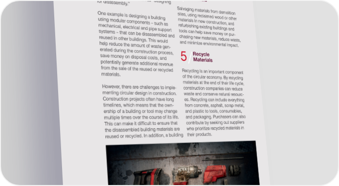 Design for designed for disassembly may not be Disassembly 3/ economically viable for a new owner who may not have the same focus on One key principle of the circular econo- sustainability or may not be willing to my is designing products and materials invest in the necessary disassembly with their end of life in mind. In construc- and recycling infrastructure. tion, this could mean designing build- ings, products and tools that can be eas- Reuse Materials ily dismantled and the materials reused 4/ or recycled. This is known as “designing for disassembly.” Salvaging materials from demolition sites, using reclaimed wood or other One example is designing a building materials in new construction, and using modular components – such as refurbishing existing buildings and mechanical, electrical and pipe support tools can help save money on pur- systems – that can be disassembled and chasing new materials, reduce waste, reused in other buildings. This would and minimize environmental impact. help reduce the amount of waste gen- erated during the construction process, Recycle Materials save money on disposal costs, and 5/ potentially generate additional revenue from the sale of the reused or recycled Recycling is an important component materials. of the circular economy. By recycling materials at the end of their life cycle, However, there are challenges to imple- construction companies can reduce menting circular design in construction. waste and conserve natural resourc- Construction projects often have long es. Recycling can include everything timelines, which means that the own- from concrete, asphalt, scrap metal, ership of a building or tool may change and plastic to tools, consumables, multiple times over the course of its life. and packaging. Purchasers can also This can make it dif昀椀cult to ensure that contribute by seeking out suppliers the disassembled building materials are who prioritize recycled materials in reused or recycled. In addition, a building their products. / 4