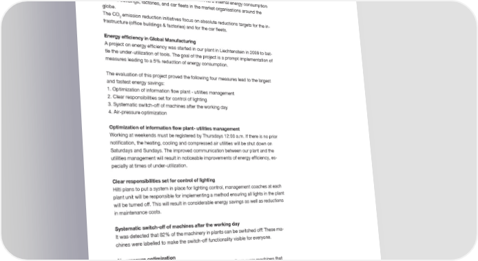 Reducing our CO emissions 2 Reducing our CO emissions 2 Corporate strategy and targets Hilti has developed a CO emission reduction strategy aiming to considerably reduce 2 the carbon footprint on the corporate level. Hilti will decouple planned economic growth in the next years from CO emissions by implementing a number of reduction 2 and substitution initiatives. The initiatives concern Hilti’s internal energy consumption in office buildings, factories, and car fleets in the market organisations around the globe. The CO emission reduction initiatives focus on absolute reductions targets for the in- 2 frastructure (office buildings & factories) and for the car fleets. Energy efficiency in Global Manufacturing A project on energy efficiency was started in our plant in Liechtenstein in 2009 to bat- tle the under-utilization of tools. The goal of the project is a prompt implementation of measures leading to a 5% reduction of energy consumption. The evaluation of this project proved the following four measures lead to the largest and fastest energy savings: 1. Optimization of information flow plant - utilities management 2. Clear responsibilities set for control of lighting 3. Systematic switch-off of machines after the working day 4. Air-pressure optimization Optimization of information flow plant- utilities management Working at weekends must be registered by Thursdays 12:00 a.m. If there is no prior notification, the heating, cooling and compressed air utilities will be shut down on Saturdays and Sundays. The improved communication between our plant and the utilities management will result in noticeable improvements of energy efficiency, es- pecially at times of under-utilization. Clear responsibilities set for control of lighting Hilti plans to put a system in place for lighting control, management coaches at each plant unit will be responsible for implementing a method ensuring all lights in the plant will be turned off. This will result in considerable energy savings as well as reductions in maintenance costs. Systematic switch-off of machines after the working day It was detected that 82% of the machinery in plants can be switched off! These ma- chines were labelled to make the switch-off functionality visible for everyone. Air-pressure optimization Labelled machines were checked for leakage. However, there were machines that leaked air when in off-mode as they had not been switched off correctly. The employ- ees in production in the plants were again reminded of the right way for switching off the machines. New machines will incorporate air pressure optimised solutions. Renewable energy We have noted that the purchase of electricity holds significant potential for reducing CO. We therefore purchase electricity at our locations in Austria largely from renew- 2 able sources (greater than 80%). Hilti keeps records of all the electricity that we pur- chase, and whenever possible we buy renewable energy from certified sources. Environmental management at Hilti 7