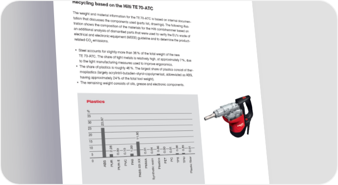 Product Carbon Footprint (PCF) The efficiency improvement of the TE 70 compared to the TE 76 results energy reductions of 11 %. Energy reductions for the TE 1000-AVR compared to the TE 905-AVR are even more impressive with remarkable 26 %. This means that customers get the work done quicker while they use less energy! Our product development teams have been equipped with the first CO emission 2 reduction guidelines and tools to improve the next generation of products. Hilti is determined to reduce the carbon footprints of its products generation by generation. Recycling based on the Hilti TE70-ATC The weight and material information for the TE70-ATC is based on internal documen- tation that discusses the components used (parts list, drawings). The following illus- tration shows the composition of the materials for the Hilti combihammer based on an additional analysis of dismantled parts that were used to verify the EU’s waste of electrical and electronic equipment (WEEE) guideline and to determine the product- related CO emissions. 2 • Steel accounts for slightly more than 36% of the total weight of the new TE 70-ATC. The share of light metals is relatively high, at approximately 7%, due to the light manufacturing measures used to improve ergonomics. • The share of plastics is roughly 46%. The largest share of plastics consist of ther- moplastics (largely acrylintril-butadien-styrol-copolymerisat, abbreviated as ABS, having approximately 24% of the total tool weight). • The remaining weight consists of oils, grease and electronic components. 3ODVWLFV S 5 & & 4 3 $ 6 1$ 1" FTJO 1& 51 51 "# 17 16 1.." 163 1MBTUJDT 9999 1MBTUJDGJCF 1" 4ZOUIFUJDS Environmental management at Hilti 19