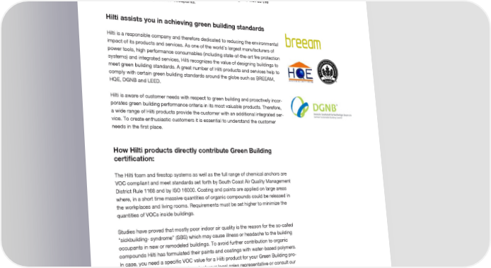 Hilti and Green Building Hilti shows leadership in Green Building The building sector is one of the major contributors to increasing global CO2 emis- sions. Green building is one important means to meet the challenge of climate change while also being highly beneficial for building owners. Green building is a globally visible trend to increase the resource efficiency of buildings as well as the comfort and well-being for their occupants. Hilti assists you in achieving green building standards Hilti is a responsible company and therefore dedicated to reducing the environmental impact of its products and services. As one of the world’s largest manufacturers of power tools, high performance consumables (including state-of-the-art fire protection systems) and integrated services, Hilti recognizes the value of designing buildings to meet green building standards. A great number of Hilti products and services help to comply with certain green building standards around the globe such as BREEAM, HQE, DGNB and LEED. Hilti is aware of customer needs with respect to green building and proactively incor- porates green building performance criteria in its most valuable products. Therefore, a wide range of Hilti products provide the customer with an additional integrated ser- vice. To create enthusiastic customers it is essential to understand the customer needs in the first place. How Hilti products directly contribute Green Building certification: The Hilti foam and firestop systems as well as the full range of chemical anchors are VOC compliant and meet standards set forth by South Coast Air Quality Management District Rule 1168 and by ISO 16000. Coating and paints are applied on large areas where, in a short time massive quantities of organic compounds could be released in the workplaces and living rooms. Requirements must be set higher to minimize the quantities of VOCs inside buildings. Studies have proved that mostly poor indoor air quality is the reason for the so-called “sickbuilding- syndrome” (SBS) which may cause illness or headache to the building occupants in new or remodeled buildings. To avoid further contribution to organic compounds Hilti has formulated their paints and coatings with water-based polymers. In case, you need a specific VOC value for a Hilti product for your Green Building pro- ject, please do not hesitate and contact your local sales representative or consult our technical support. We are happy to provide you with VOC values compliant with LEED (USA) the Green Star (Australia), DGNB (Germany) and HQE (France). This is only one example that shows how Hilti products can directly contribute to a green building project. Your local Hilti partner is happy to show you further positive attributes of Hilti products in the context of green building. Environmental management at Hilti 21