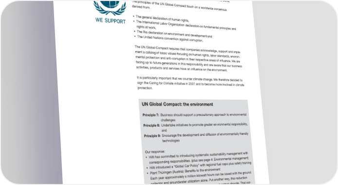 International commitment Climate Change requires international commitment Acting responsibly towards society and the environment is part of Hilti’s corporate culture. This is why membership in the UN Global Compact is consistent with wanting to have our societal commitment reflected more strongly to the external world. The principles of the UN Global Compact touch on a worldwide consensus derived from: • The general declaration of human rights, • The International Labor Organization declaration on fundamental principles and rights at work, • The Rio declaration on environment and development and • The United Nations convention against corruption. The UN Global Compact requires that companies acknowledge, support and imple- ment a catalog of basic values focusing on human rights, labor standards, environ- mental protection and anti-corruption in their respective areas of influence. We are facing up to future generations in this responsibility and are aware that our business activities, products and services have an influence on the environment. It is particularly important that we counter climate change. We therefore decided to sign the Caring for Climate initiative in 2007 and to become more involved in climate protection. UN Global Compact: the environment Principle 7: Business should support a precautionary approach to environmental challenges Principle 8: Undertake initiatives to promote greater environmental responsibility, and Principle 9: Encourage the development and diffusion of environmentally friendly technologies Our response: • Hilti has committed to introducing systematic sustainability ma nagement with corresponding responsibilities. (plus see page 4: Environmental management) • Hilti introduced a “Global Car Policy” with regional fuel caps plus safety training • Plant Thüringen (Austria): Benefits to the environment Each year approximately a million kilowatt hours can be saved with the ground collector and groundwater utilization alone. Put another way, this reduction in energy saves approximately 210,000 kilograms of carbon dioxide. That cor- responds to the CO emissions of an average car travelling approximately 2 1,300,000 kilometres per year. 6 Environmental management at Hilti