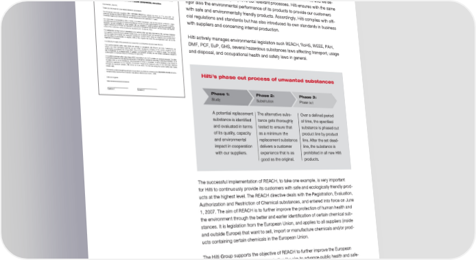 Compliance worldwide Compliance with regulations worldwide Hilti handles its corporate responsibility by closely monitoring new trends concerning health, safety and environment. To ensure health and safe workplaces on the one Hilti XXXXXXXXXXX Street nr zipcode city hand, and environmental protection on the other hand, is a must for Hilti and we de- www.hilti.com� Our reference: XXXXXXX T +XXXXXXXXXXXX F +XXXXXXXXXXX termined to continuously improve our relevant processes. Hilti ensures with the same E�[email protected] Page 1�of 2 D 02.06.2009 rigor also the environmental performance of its products to provide our customers REACH regulation (EC) 1907/2006 & RoHS (2002/95/EG) directive with safe and environmentally friendly products. Accordingly, Hilti complies with offi- Dear Madam, dear Sir, Thank you very much for your valued interest in our products. cial regulations and standards but has also introduced its own standards in business st The European chemicals regulation (EC)�1907/2006�REACH has entered into force on 1 of June 2007. All chemical substances that are either new or already on the European market will be registered with the European Chemicals Agency (EChA) in Finland in a multi-step process over a period of 11 years. with suppliers and concerning internal production. As a formulator of preparations Hilti is mostly a so-called downstream�user for the purpose of REACH. Unlike manufacturers and importers of chemical substances we are not under legal obligation to pre-register or register. However, we are constantly in close contact with our suppliers in order to ensure that they pre-register and register substances of concern for Hilti both in time and in compliance with REACH. We also make sure that the use(s) of our customers will be included as required by Art. 10 and Art. 37(2). For substances on their own, in preparations or in articles which are being imported by Hilti, we have contacted our suppliers in good time and clarified whether they, e.g. by appointing an only�representative�according to Art. 8, Hilti actively manages environmental legislation such REACH, RoHS, WEEE, PAH, will pre-register and register the respective substances. In those cases where our suppliers communicated they did not intend to pre-register or register, Hilti as the importer has done the pre-registration and will do the registration if necessary. DMF, PCF, EuP, GHS, several hazardous substances laws affecting transport, usage A continuity of supply of the products you source from us is therefore assured under REACH. Our current material safety data sheets are already in compliance with REACH Art. 31(6). Furthermore, our articles and their packaging materials do not contain substances included on the current candidate� list for and disposal, and occupational health and safety laws in general. authorization according to Art. 33 and 59(1, 10) in a concentration above 0.1 % weight by weight. The candidate list is monitored on a regular basis. In addition, our products currently do not contain substances subject to authorization or restriction (REACH Annexes XIV and XVII). A so-called extended�safety�data�sheet (eSDS) according to Art. 31(7) contains an exposure�scenario. The latter is primarily relevant for manufacturers/importers of dangerous substances according to directive 67/548/EEC or of so-called PBT or vPvB substances if the threshold of 10 t/yr is exceeded. It will be prepared in the course of substance registration by our suppliers if necessary. Should it be required to pass on new information obtained through an exposure scenario, Hilti will do so in an eSDS. For the time being the current safety data sheets remain valid. We hereby confirm that all the products we provide to you that are covered by the 2002/95/EG�(RoHS) directive, fundamentally meet the RoHS directive stipulations effective as of July 1, 2006. +LOWL·VSKDVHRXWSURFHVVRIXQZDQWHGVXEVWDQFHV With kind regards Hilti XXXXXXXXXXXXXXXXXXXX Signature 1 Signature 2 3KDVH 3KDVH 3KDVH 4UVEZ 4VCTUJUVUJPO 1IBTFPVU "QPUFOUJBMSFQMBDFNFOU 5IFBMUFSOBUJWFTVCT 0WFSBEFGJOFEQFSJPE TVCTUBODFJTJEFOUJGJFE UBODFHFUTUIPSPVHIMZ PGUJNF UIFTQFDJGJFE BOEFWBMVBUFEJOUFSNT UFTUFEUPFOTVSFUIBU TVCTUBODFJTQIBTFEPVU PGJUTRVBMJUZ DBQBDJUZ BTBNJOJNVNUIF QSPEVDUMJOFCZQSPEVDU BOEFOWJSPONFOUBM SFQMBDFNFOUTVCTUBODF MJOF"GUFSUIFTFUEFBE JNQBDUJODPPQFSBUJPO EFMJWFSTBDVTUPNFS MJOF UIFTVCTUBODFJT XJUIPVSTVQQMJFST FYQFSJFODFUIBUJTBT QSPIJCJUFEJOBMMOFX)JMUJ HPPEBTUIFPSJHJOBM QSPEVDUT The successful implementation of REACH, to take one example, is very important for Hilti to continuously provide its customers with safe and ecologically friendly prod- ucts at the highest level. The REACH directive deals with the Registration, Evaluation, Authorization and Restriction of Chemical substances, and entered into force on June 1, 2007. The aim of REACH is to further improve the protection of human health and the environment through the better and earlier identification of certain chemical sub- stances. It is legislation from the European Union, and applies to all suppliers (inside and outside Europe) that want to sell, import or manufacture chemicals and/or prod- ucts containing certain chemicals in the European Union. The Hilti Group supports the objective of REACH to further improve the European Union’s regulation on chemicals, including the aim to advance public health and safe- ty and to protect the environment. We have requested our chemicals suppliers to (pre)register the chemicals they supply us with, in order to ensure compliance and no interruption of the supply flow. The limited number of chemicals that we produce and import ourselves has been entered into the pre-registration process already. Addition- ally, we have requested our component or finished products suppliers to provide us information on the relevant chemicals in their supplied products. This enables us to provide our customers with a comprehensive compliance statement addre