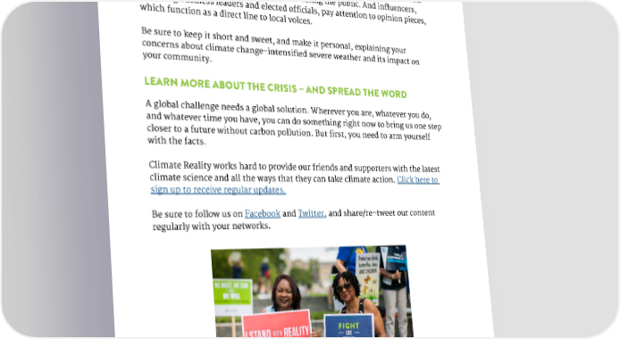 WRITE A LETTER TO THE EDITOR The opinions section of a publication is one of the most valuable places to discuss the climate crisis. By writing a letter to the editor, your insights and opinions on the topic will be out there for hundreds or even thousands of people to read. It’s an incredible tool for reaching and educating the public. And influencers, including business leaders and elected officials, pay attention to opinion pieces, which function as a direct line to local voices. Be sure to keep it short and sweet, and make it personal, explaining your concerns about climate change-intensified severe weather and its impact on your community. LEARN MORE ABOUT THE CRISIS – AND SPREAD THE WORD A global challenge needs a global solution. Wherever you are, whatever you do, and whatever time you have, you can do something right now to bring us one step closer to a future without carbon pollution. But first, you need to arm yourself with the facts. Climate Reality works hard to provide our friends and supporters with the latest climate science and all the ways that they can take climate action. Click here to sign up to receive regular updates. Be sure to follow us on Facebook and Twitter, and share/re-tweet our content regularly with your networks. 19