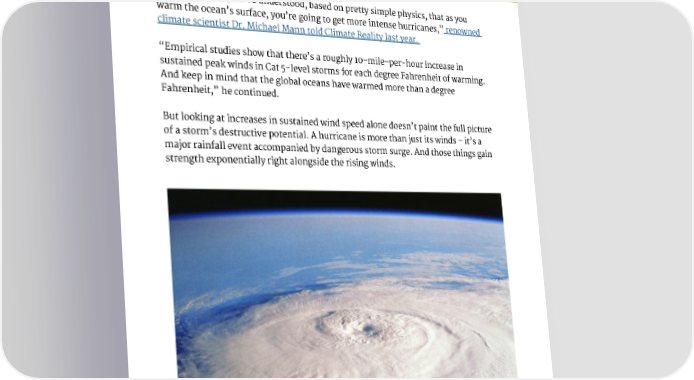 HURRICANES “For a long time, we’ve understood, based on pretty simple physics, that as you warm the ocean’s surface, you’re going to get more intense hurricanes,” renowned climate scientist Dr. Michael Mann told Climate Reality last year. “Empirical studies show that there’s a roughly 10-mile-per-hour increase in sustained peak winds in Cat 5-level storms for each degree Fahrenheit of warming. And keep in mind that the global oceans have warmed more than a degree Fahrenheit,” he continued. But looking at increases in sustained wind speed alone doesn’t paint the full picture of a storm’s destructive potential. A hurricane is more than just its winds – it’s a major rainfall event accompanied by dangerous storm surge. And those things gain strength exponentially right alongside the rising winds. 3