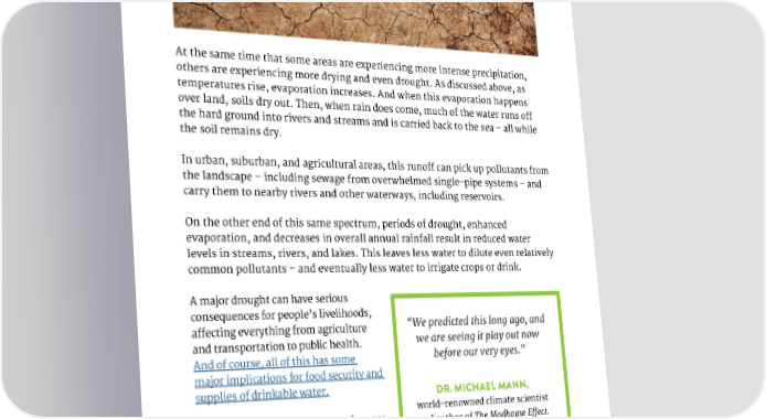 DROUGHT At the same time that some areas are experiencing more intense precipitation, others are experiencing more drying and even drought. As discussed above, as temperatures rise, evaporation increases. And when this evaporation happens over land, soils dry out. Then, when rain does come, much of the water runs off the hard ground into rivers and streams and is carried back to the sea – all while the soil remains dry. In urban, suburban, and agricultural areas, this runoff can pick up pollutants from the landscape – including sewage from overwhelmed single-pipe systems – and carry them to nearby rivers and other waterways, including reservoirs. On the other end of this same spectrum, periods of drought, enhanced evaporation, and decreases in overall annual rainfall result in reduced water levels in streams, rivers, and lakes. This leaves less water to dilute even relatively common pollutants – and eventually less water to irrigate crops or drink. A major drought can have serious consequences for people’s livelihoods, affecting everything from agriculture “We predicted this long ago, and and transportation to public health. we are seeing it play out now And of course, all of this has some before our very eyes.” major implications for food security and supplies of drinkable water. DR. MICHAEL MANN, world-renowned climate scientist Then there are consequences of severe and author of The Madhouse E昀昀ect. drought you might not immediately think about – like the role it plays in worsening forest fires. Learn More: Soil Health and Climate Change 9