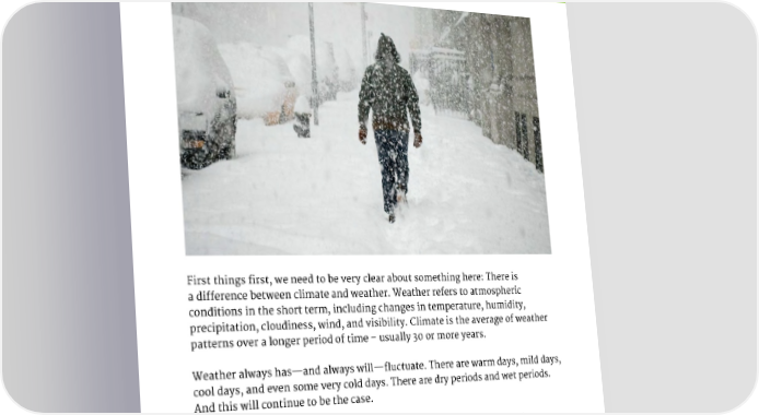 EXTREME COLD First things first, we need to be very clear about something here: There is a difference between climate and weather. Weather refers to atmospheric conditions in the short term, including changes in temperature, humidity, precipitation, cloudiness, wind, and visibility. Climate is the average of weather patterns over a longer period of time – usually 30 or more years. Weather always has—and always will—fluctuate. There are warm days, mild days, cool days, and even some very cold days. There are dry periods and wet periods. And this will continue to be the case. When we talk about climate, we are talking about long-term trends and expectations. Some skeptics, however, like to point to cold snaps as evidence against climate change. In many instances, they couldn’t be more wrong. 15
