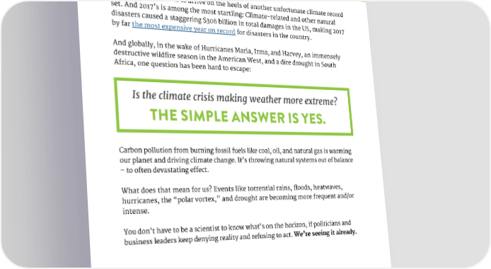 INTRODUCTION Every new year seems to arrive on the heels of another unfortunate climate record set. And 2017’s is among the most startling: Climate-related and other natural disasters caused a staggering $306 billion in total damages in the US, making 2017 by far the most expensive year on record for disasters in the country. And globally, in the wake of Hurricanes Maria, Irma, and Harvey, an immensely destructive wildfire season in the American West, and a dire drought in South Africa, one question has been hard to escape: Is the climate crisis making weather more extreme? THE SIMPLE ANSWER IS YES. Carbon pollution from burning fossil fuels like coal, oil, and natural gas is warming our planet and driving climate change. It’s throwing natural systems out of balance – to often devastating effect. What does that mean for us? Events like torrential rains, floods, heatwaves, hurricanes, the “polar vortex,” and drought are becoming more frequent and/or intense. You don’t have to be a scientist to know what’s on the horizon, if politicians and business leaders keep denying reality and refusing to act. We’re seeing it already. 2
