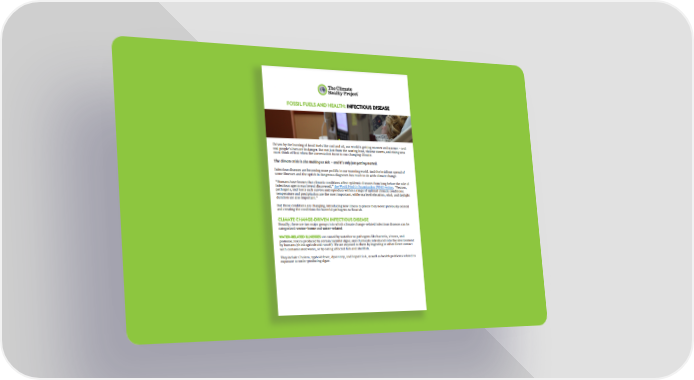 FOSSIL FUELS AND HEALTH: INFECTIOUS DISEASE Driven by the burning of fossil fuels like coal and oil , our world is getting warmer and warmer – and real people’s lives are in danger. But not just from the searing heat, violent storms, and rising seas most think of first when the conversation turns to our changing climate. The c limate c risis is also making us sick – and it’s only just getting started . I nfectious diseases are becoming more prolific in our warming world. And the insidious spread of some illnesses and the uptick in dangerous diagnoses has much to do with climate c hange . “Humans have known that climatic conditions affect epidemic diseases from long before the role of infectious agents was [even] discovered,” the World Health Organization (WHO) writes . “ Vectors, pathogens , and hosts each survive and reproduce within a range of optimal climatic conditions: temperature and precipitation are the most important, while sea level elevation, wind, and daylight duration are also important.” But those conditions are changing, introducing new illness to places they never previously existed and creating the conditions for harmful pathogens to flourish . CLIMATE CHANGE-DRIVEN INFECTIOUS DISEASE Broadly, there are two major groups into which climate change - related infectious diseases can be categorized: vector - borne and water - related . WATER-RELATED ILLNESSES are caused by waterborne pathogens like bacteria, viruses, and protozoa; toxins produced by certain harmful algae; and chemicals introduced into the environment by humans (think agricultural runoff). We are exposed to them by ingesti ng or other direct contact with contaminated water , or by eating affected fish and shellfish. They includ e: Cholera, typhoid fever, dysentery, and hepatitis A , as well as health problems related to exposure to toxin - producing algae.