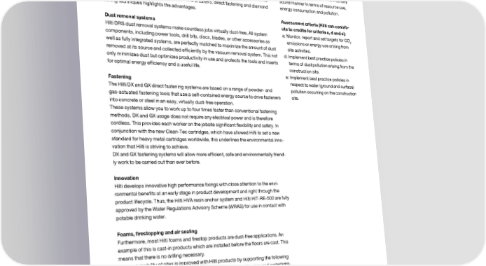 Green Building with BREEAM Man 3: Construction site impact Hilti contribution Criteria Unlike other suppliers, Hilti offers alternative solutions for many common applications, Aim resulting in more productive energy use and greatly reduced exposure to dust with To recognize and encourage construc- best practice solutions to safeguard water. Hilti offers a range of power tools, vacuum tion sites managed in an environmentally cleaners, insert tools and accessories which allow significant reduction of dust emis- sound manner in terms of resource use, sions. A comparison of rotary hammers and breakers, direct fastening and diamond energy consumption and pollution. coring techniques highlights the advantages. Assessment criteria (Hilti can contrib- Dust removal systems ute to credits for criteria a, d and e): Hilti DRS dust removal systems make countless jobs virtually dust-free. All system a: Monitor, report and set targets for CO2 components, including power tools, drill bits, discs, blades, or other accessories as emissions or energy use arising from well as fully integrated systems, are perfectly matched to maximize the amount of dust site activities. removed at its source and collected efficiently by the vacuum removal system. This not d: Implement best practice policies in only minimizes dust but optimizes productivity in use and protects the tools and inserts terms of dust pollution arising from the for optimal energy efficiency and a useful life. construction site. e: Implement best practice policies in Fastening respect to water (ground and surface) The Hilti DX and GX direct fastening systems are based on a range of powder- and pollution occurring on the construction gas-actuated fastening tools that use a self-contained energy source to drive fasteners site. into concrete or steel in an easy, virtually dust-free operation. These systems allow you to work up to four times faster than conventional fastening methods. DX and GX usage does not require any electrical power and is therefore cordless. This provides each worker on the jobsite significant flexibility and safety. In conjunction with the new Clean-Tec cartridges, which have allowed Hilti to set a new standard for heavy metal cartridges worldwide, this underlines the environmental inno- vation that Hilti is striving to achieve. DX and GX fastening systems will allow more efficient, safe and environmentally friend- ly work to be carried out than ever before. Innovation Hilti develops innovative high performance fixings with close attention to the envi- ronmental benefits at an early stage in product development and right through the product lifecycle. Thus, the Hilti HVA resin anchor system and Hilti HIT-RE-500 are fully approved by the Water Regulations Advisory Scheme (WRAS) for use in contact with potable drinking water. Foams, firestopping and air sealing Furthermore, most Hilti foams and firestop products are dust-free applications. An example of this is cast-in products which are installed before the floors are cast. This means that there is no drilling necessary. The sustainability of sites is improved with Hilti products by supporting the following important characteristics of a building: movement capability, firestop and watertight- ness. Movement capability allows the tracing of building movement. Firestop proper- ties of Hilti products are tested to various worldwide standards to reduce damage due to fire, even during the building phase. Watertightness aids in avoiding jobsite damage due to water penetration, either through rain or during a fire. Thus, using Hilti tools and accessories can further improve the potential for BREEAM credits. page 11
