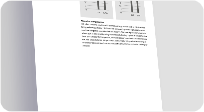 Green Building ([DPSOH ([DPSOH $PNCJIBNNFSLHDMBTT #SFBLFSTLHDMBTT 5& 5& 5&"73 5&"73 ࡱ ࡱ Alternative energy sources Hilti offers fastening solutions with alternative energy sources such as Hilti Direct Fas- tening technology utilising Hilti Clean-Tec cartridges to power a captive piston which can drive fixings into concrete, steel and masonry. There are significant environmental advantages to be gained by using this cordless technology in place of drill and fix since there is no vibration to the operator, minimal exposure to dust and no electrical energy use. Hilti Direct fastening also provides a tested reliable fixing method with a range of small steel fasteners which can also reduce the amount of raw material in the fixing ap- plication. page 10