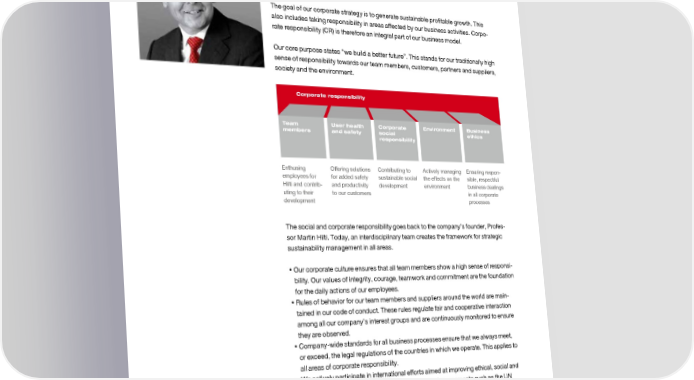 Green Building with BREEAM “We build a better future”: corporate responsibility at Hilti “We can only enjoy long-term financial success if we take our corporate responsibili- ties, in terms of society, economy and the environment, seriously.” Bo Risberg, Chief Executive Officer, Hilti Corporation The goal of our corporate strategy is to generate sustainable profitable growth. This also includes taking responsibility in areas affected by our business activities. Corpo- rate responsibility (CR) is therefore an integral part of our business model. Our core purpose states “we build a better future”. This stands for our traditionally high sense of responsibility towards our team members, customers, partners and suppliers, society and the environment. &RUSRUDWHUHVSRQVLELOLW\ 7HDP 8VHUKHDOWK &RUSRUDWH (QYLURQPHQW %XVLQHVV PHPEHUV DQGVDIHW\ VRFLDO HWKLFV UHVSRQVLELOLW\ Enthusing Offering solutions Contributing to Actively managing Ensuring respon- employees for for added safety sustainable social the effects on the sible, respectful Hilti and contrib - and productivity devel opment en vironment business dealings uting to their to our customers in all corporate development processes The social and corporate responsibility goes back to the company’s founder, Profes- sor Martin Hilti. Today, an interdisciplinary team creates the framework for strategic sustainability management in all areas. • Our corporate culture ensures that all team members show a high sense of responsi- bility. Our values of integrity, courage, teamwork and commitment are the foundation for the daily actions of our employees. • Rules of behavior for our team members and suppliers around the world are main- tained in our code of conduct. These rules regulate fair and cooperative interaction among all our company’s interest groups and are continuously monitored to ensure they are observed. • Company-wide standards for all business processes ensure that we always meet, or exceed, the legal regulations of the countries in which we operate. This applies to all areas of corporate responsibility. • We actively participate in international efforts aimed at improving ethical, social and ecological standards in business life. As a partner in agreements such as the UN Global Compact, the Partnering Against Corruption Initiative or the UN Caring for Cli- mate initiative, our goal is to positively influence the economy with our values in mind. page 4