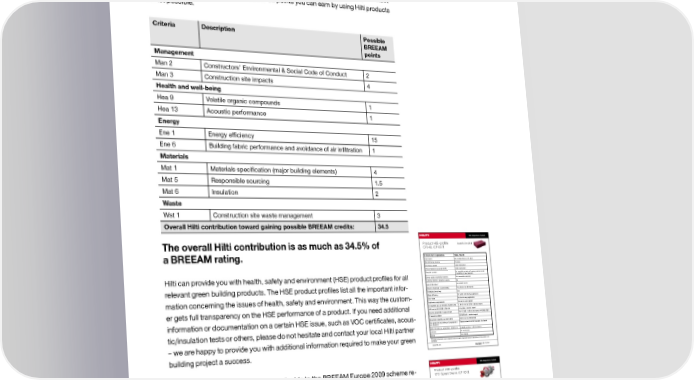 Green Building with BREEAM Hilti’s contribution to BREEAM certification: *The use of Hilti products stated in this brochure should help raise the potential for gaining possible BREEAM points for your building project. Due to the fact that the us- age of individual products does not directly result in possible BREEAM points (only the total building project can earn possible BREEAM credits and be certified), an exact calculation of how many possible BREEAM points you can earn by using Hilti products is not possible. Criteria Description Possible BREEAM points Management Man 2 Constructors' Environmental & Social Code of Conduct 2 Man 3 Construction site impacts 4 Health and well-being Hea 9 Volatile organic compounds 1 Hea 13 Acoustic performance 1 Energy Ene 1 Energy efficiency 15 Ene 6 Building fabric performance and avoidance of air infiltration 1 Materials Mat 1 Materials specification (major building elements) 4 Mat 5 Responsible sourcing 1.5 Mat 6 Insulation 2 Waste Wst 1 Construction site waste management 3 Overall Hilti contribution toward gaining possible BREEAM credits: 34.5 Product HSE-profile Issued 01.Oct.2010 The overall Hilti contribution is as much as 34.5% of CFS-BL (CP 657) Criteria incl. explanation Value/Result a BREEAM rating. Description Pre-formed block on PU basis Manufacturing location Germany CO 2 equiv. (CO2e) Under evaluation Ozone depletion potential (ODP) Under evaluation No recycled content as Firestop products need Recycled content traceability of raw materials No renewable materials Hilti can provide you with health, safety and environment (HSE) product profiles for all Share rapidly renewable materials: Labeling needed / dangerous goods No Household waste End of life status¹ Yes, blocks can be reused relevant green building products. The HSE product profiles list all the important infor- Reuse of materials / Convertibility Yes Packaging (recycling) No water used during application Water e昀케ciency No dust during application mation concerning the issues of health, safety and environment. This way the custom- Dust value No electric tool needed Application requirements < 6 m³/h m² at 50 Pa – see test report Air tightness acc to EN 1026 / ASTM E 283 er gets full transparency on the HSE performance of a product. If you need additional VOC acc to LEED 2009 / EPA #24 4,4 g/liter – see test report Rw = 50 dB – refer to test report A 48389/3093 Acoustic properties in gypsum wall 0,066 W/mK – see test report Thermal insulation Given, but not determined information or documentation on a certain HSE issue, such as VOC certificates, acous- Movement capability acc ISO 11600 Please contact Hilti BU Chemicals for details Fire protection according to European and US standards tic/insulation tests or others, please do not hesitate and contact your local Hilti partner Mold resistant acc to ISO 846 / ASTM G 21 Suitable product – see test report No restrictions Lifetime MSDS Not needed ¹Provision of statement concerning waste status (recyclable, standard disposal or hazardous) of Hilti products incl. – we are happy to provide you with additional information required to make your green packaging www.hilti.com HSE-Profile CP 657 I CEPsp I building project a success. 01.10.2010 This list of potential points is only applicable to the BREEAM Europe 2009 scheme re- Product HSE-profile CFS-Speed Sleeve (CP 653) leased by BREEAM International. Updated versions of the BREEAM Europe standard CP 653 Speed Sleeve is used for permanent firestop seals in small openings o昀昀ering 2 dimensions (diameter 2”and 4”) for cable penetrations. Criteria Result / Values Rating Description Metal housing with firestop inlay may impact the potential points based on altered, new and/or additional requirements. and glass fiber as smoke stop Manufacturing location Malaysia PCF: CO2 equivalent Under evaluation Ozone depletion potential (ODP) Under evaluation These potential points are suggestions only and need to be verified by BREEAM In- Labeling needed / dangerous goods No ++ Halogene free - no use of halogenated Yes ++ materials VOC acc to LEED 2009 / EPA #24 7,6 g/liter - no test report according ++ to LEED 2009 / EPA #24 ternational. BREEAM International has the final authority to resolve any discrepancies Air tightness acc to EN 1026 Smoke tight. Value not measured. + Acoustic properties in gypsum wall Dn,e,w = 54 dB, STC 47 dB + – refer to test report 164 44278 Thermal insulation not determined 0 Movement capability acc ISO 11600 Mechanical part is stable. Cables ++ regarding points. are able to move freely Mold resistant acc to ISO 846 / ASTM G Suitable product – test report for ++ 21 membrane dated 23.Jan 2008 Fire protection according to European Yes, please contact Hilti BU ++ and US standards Chemicals for details Lifetime No restrictions ++ No recycled content as Firestop Recycled content products need traceability of raw 0 materials Not all products listed in this document are available in all areas. Check with your local Share rapidly renewable materials: No renewable materials 0 Housing and matal parts can be Reuse of materials / Convertibility reused. CP 653 speed Sleeve is ++ repenetrable Hilti sales representative or distributor to determine available products in your area. Recycling of packaging Yes ++ End of life status¹ Household waste ++ Water efficiency No water used during application ++ Dust value No dust during cable installation ++ Application requirements Tool for drilling hole needed 0 MSDS Not needed Please consult technical support or your local sales representative if you have ques- ¹ Provision of statement concerning waste status (recyclable, standard disposal or hazardous) of Hilti products incl. packaging ++ = Excellent + = Good 0 = Neutral / not determined - = tions about whether a particular product can help earn BREEAM points. Negative Issued Feb 2011 BU Chemicals, Product Care www.hilti.com HSE-Profile I CEPsp page 7