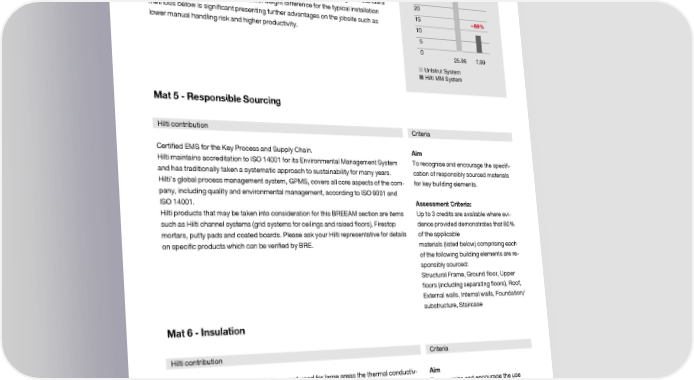 Green Building with BREEAM CO2 Reduction using Hilti MM Channel System &2 UHGXFWLRQ !&2 UHGXFWLRQ The innovative Hilti MM Channel System reduces the amount and weight of steel LQ7UDGLWLRQDO7UDSH]H LQ6WDQGDUG7UDSH]H required to support pipe runs without compromising on load performance thanks to ,QVWDOODWLRQV ,QVWDOODWLRQV intelligent engineering. >*:3LQNJ&2 @ >*:3LQNJ&2 @ Hilti has taken an holistic approach to analyse the CO savings made by installing the 2 Hilti MM system having commissioned a third party accredited environmental con- sultant to compare full LCA data for the Hilti MM channel system along with standard traditional Unistrut products. The steel weight difference for the typical installation ² methods below is significant presenting further advantages on the jobsite such as ² lower manual handling risk and higher productivity. 8QLVWUXW6\VWHP 8QLVWUXW6\VWHP +LOWL006\VWHP +LOWL006\VWHP Mat 5 - Responsible Sourcing Hilti contribution Criteria Certified EMS for the Key Process and Supply Chain. Aim Hilti maintains accreditation to ISO 14001 for its Environmental Management System To recognise and encourage the specifi- and has traditionally taken a systematic approach to sustainability for many years. cation of responsibly sourced materials Hilti’s global process management system, GPMS, covers all core aspects of the com- for key building elements. pany, including quality and environmental management, according to ISO 9001 and ISO 14001. Assessment Criteria: Hilti products that may be taken into consideration for this BREEAM section are items Up to 3 credits are available where evi- such as Hilti channel systems (grid systems for ceilings and raised floors), Firestop dence provided demonstrates that 80% mortars, putty pads and coated boards. Please ask your Hilti representative for details of the applicable on specific products which can be verified by BRE. materials (listed below) comprising each of the following building elements are re- sponsibly sourced: Structural Frame, Ground floor, Upper floors (including separating floors), Roof, External walls, Internal walls, Foundation/ substructure, Staircase Mat 6 - Insulation Hilti contribution Criteria As Hilti foam and firestop products are not used for large areas the thermal conductiv- Aim ity was only measured for selected materials. To recognize and encourage the use of thermal insulation which has a low Hilti is happy to provide you with relevant technical details for the tested materials embodied environmental impact relative which confirm their thickness and thermal conductivity. to its thermal properties and has been responsibly sourced. Assessment criteria: Credits are awarded for embodied im- pact of insulation materials used and their responsible sourcing. page 17