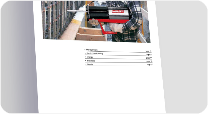 Green Building with BREEAM Page 7 Page 9Green Building with BREEAM How Hilti products and services contribute to BREEAM credits: • Management page 9 • Health & well-being page 12 • Energy page 14 • Materials page 15 • Waste page 17 page 8