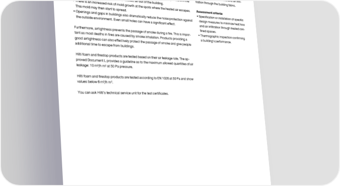 Green Building with BREEAM Ene 6: Building fabric performance and avoidance of air infiltration Hilti contribution Criteria Reduced air infiltration in a building is extremely important for several reasons: Aim To recognize and encourage measures • There is a significant loss of energy caused by air leakage, especially when the taken to minimize heat loss and air infil- building is equipped with air conditioning. There is also a certain overpressure in the tration through the building fabric. rooms which forces the heated or cooled air out of the building. • There is an increased risk of mold growth at the spots where the heated air escapes. Assessment criteria: This mold may then start to spread. • Specification or installation of specific • Openings and gaps in buildings also dramatically reduce the noise protection against design measures to minimize heat loss the outside environment. Even small holes can have a significant effect. and air infiltration through treated con- fined spaces. Furthermore, airtightness prevents the passage of smoke during a fire. This is impor- • Thermographic inspection confirming tant as most deaths in fires are caused by smoke inhalation. Products providing a a building’s performance. good airtightness can also effectively protect the passage of smoke and give people additional time to escape from buildings. Hilti foam and firestop products are tested based on their air leakage rate. The ap- proved Document L provides a guideline as to the maximum allowed quantities of air leakage: 10 m³/h m² at 50 Pa pressure. Hilti foam and firestop products are tested according to EN 1026 at 50 Pa and show values below 6 m³/h m². You can ask Hilti’s technical service unit for the test certificates. page 15