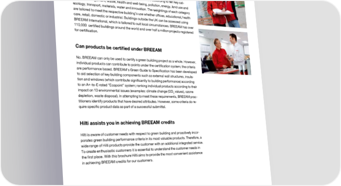 Green Building with BREEAM What is BREEAM? BREEAM is a third-party certification program which provides a benchmark for the de- sign, construction and operation of high-performance green buildings. BREEAM gives building owners and operators the tools they need to have an immediate and measur- able impact on their buildings’ performance. Projects assessed by the BREEAM standards are rated according to ten key cat- egories: management, waste, health and well-being, pollution, energy, land use and ecology, transport, materials, water and innovation. The weightings of each category are tailored to meet the respective building’s use whether offices, educational, health care, retail, domestic or industrial. Buildings outside the UK can be assessed using BREEAM International, which is tailored to suit local circumstances. BREEAM has over 110,000 certified buildings around the world and over half a million projects registered for certification. Can products be certified under BREEAM No. BREEAM can only be used to certify a green building project as a whole. However, individual products can contribute to points under the certification system; the criteria are performance based. BREEAM’s Green Guide to Specification has been developed to aid selection of key building components such as external wall structures, insula- tion and windows (which contribute significantly to building performance) according to an A+-to-E-rated “Ecopoint” system; ranking individual products according to their impact on 13 environmental issues (examples: climate change (CO values), ozone 2 depletion, waste disposal). In attempting to meet these requirements, BREEAM prac- titioners identify products that have desired attributes. However, some criteria do re- quire specific product data as part of a successful submittal. Hilti assists you in achieving BREEAM credits Hilti is aware of customer needs with respect to green building and proactively incor- porates green building performance criteria in its most valuable products. Therefore, a wide range of Hilti products provide the customer with an additional integrated service. To create enthusiastic customers it is essential to understand the customer needs in the first place. With this brochure Hilti aims to provide the most convenient assistance in achieving BREEAM credits for our customers. page 5