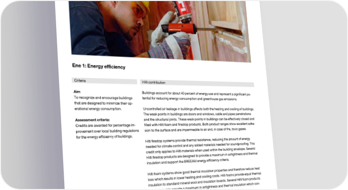 Green Building with BREEAM Energy Ene 1: Energy efficiency Criteria Hilti contribution Aim Buildings account for about 40 percent of energy use and represent a significant po- To recognize and encourage buildings tential for reducing energy consumption and greenhouse gas emissions. that are designed to minimize their op- erational energy consumption. Uncontrolled air leakage in buildings affects both the heating and cooling of buildings. The weak points in buildings are doors and windows, cable and pipes penetrations Assessment criteria: and the structural joints. These weak points in buildings can be effectively closed and Credits are awarded for percentage im- filled with Hilti foam and firestop products. Both product ranges show excellent adhe- provement over local building regulations sion to the surface and are impermeable to air and, in case of fire, toxic gases. for the energy efficiency of buildings. Hilti firestop systems provide thermal resistance, reducing the amount of energy needed for climate control and any added materials needed for soundproofing. This credit only applies to Hilti materials when used within the building envelope. Several Hilti firestop products are designed to provide a maximum in airtightness and thermal insulation and support the BREEAM energy efficiency criteria. Hilti foam systems show good thermal insulation properties and therefore reduce heat loss which results in lower heating and cooling costs. Hilti foams provide equal thermal insulation to standard mineral wool and insulation boards. Several Hilti foam products are designed to provide a maximum in airtightness and thermal insulation which con- tributes to support the BREEAM criteria as well. page 14