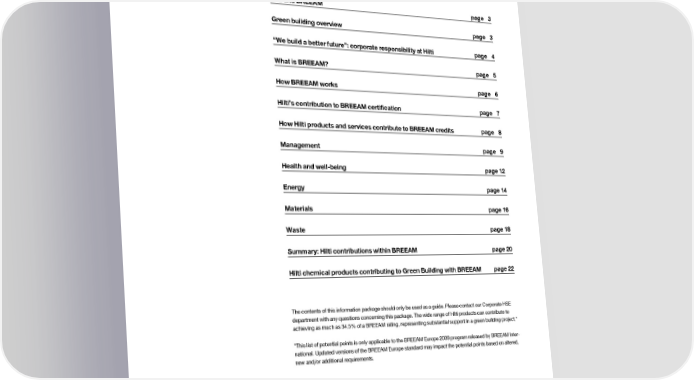 Green Building with BREEAM Contents Hilti and BREEAM page 3 Green building overview page 3 “We build a better future”: corporate responsibility at Hilti page 4 What is BREEAM? page 5 How BREEAM works page 6 Hilti’s contribution to BREEAM certification page 7 How Hilti products and services contribute to BREEAM credits page 8 Management page 9 Health and well-being page 12 Energy page 14 Materials page 16 Waste page 18 Summary: Hilti contributions within BREEAM page 20 Hilti chemical products contributing to Green Building with BREEAM page 22 The contents of this information package should only be used as a guide. Please contact our Corporate HSE department with any questions concerning this package. The wide range of Hilti products can contribute to achieving as much as 34.5% of a BREEAM rating, representing substantial support in a green building project.* *This list of potential points is only applicable to the BREEAM Europe 2009 program released by BREEAM Inter- national. Updated versions of the BREEAM Europe standard may impact the potential points based on altered, new and/or additional requirements. page 2